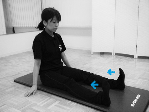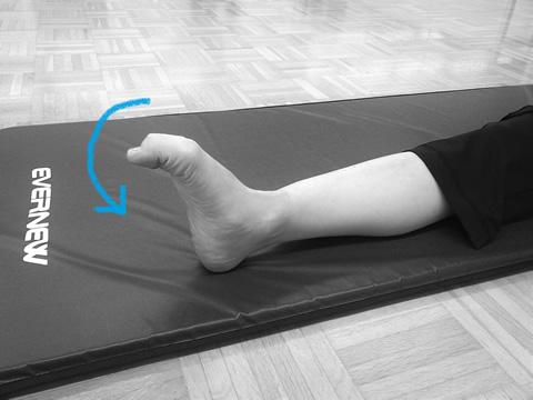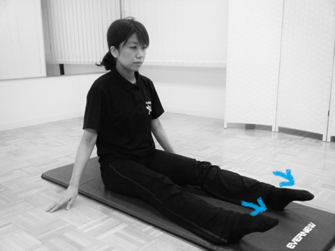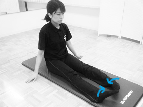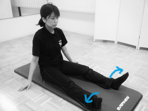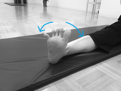 【2】次に、自分の方に向けた足の指先を【逆】に自分の反対側に押すように傾けてください