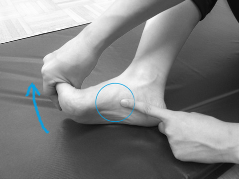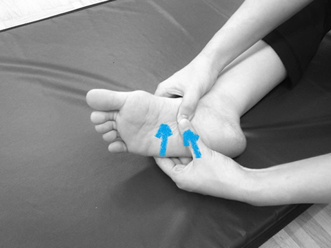 「土踏まず」がすぐにわからない方は、まず足の親指を写真のように上げてください。